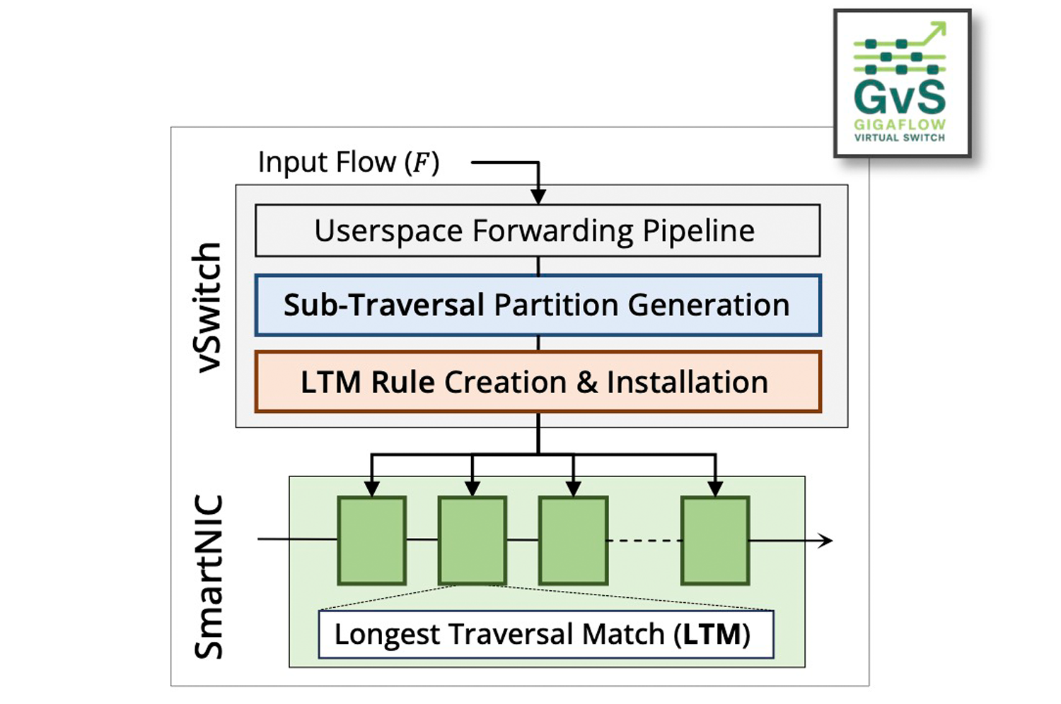 Implemented in P4, LTM tables are simple: each stage matches on a tag (table ID) and relevant packet headers, then updates the tag (next expected sub-traversal’s table ID), modifies the packet based on actions, and forwards to the following LTM table. This design makes Gigaflow naturally compatible with today’s P4-programmable SmartNICs and FPGAs.